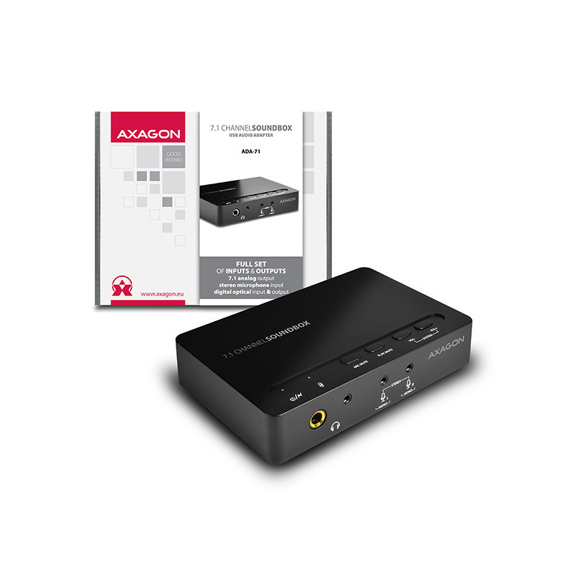 Externí 7.1 kanálová USB zvuková karta AXAGON ADA-71 SOUNDbox rozšíří počítač o prostorový zvuk a množství audio vstupů a výstupů.