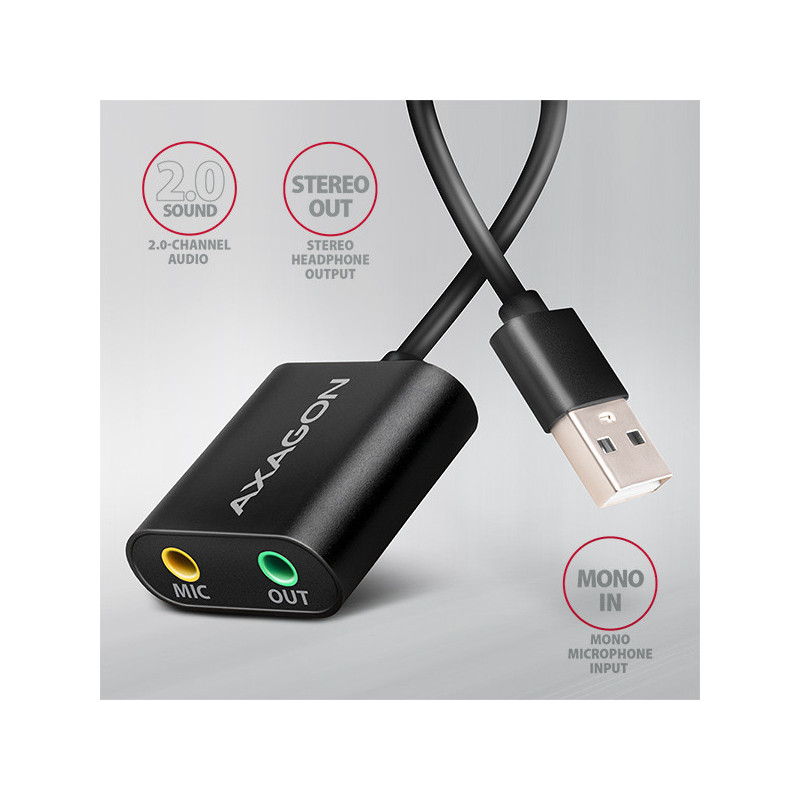 Zvuková karta je vhodná jak pro stolní počítače, tak pro notebooky a dovolí připojení sluchátek nebo aktivních reproduktorů a mikrofonu. Kovový obal adaptéru je vyrobený z hliníku a zajišťuje tak dokonalou mechanickou ochranu. Napevno uchycený kabel zaručí dostatečnou flexibilitu.