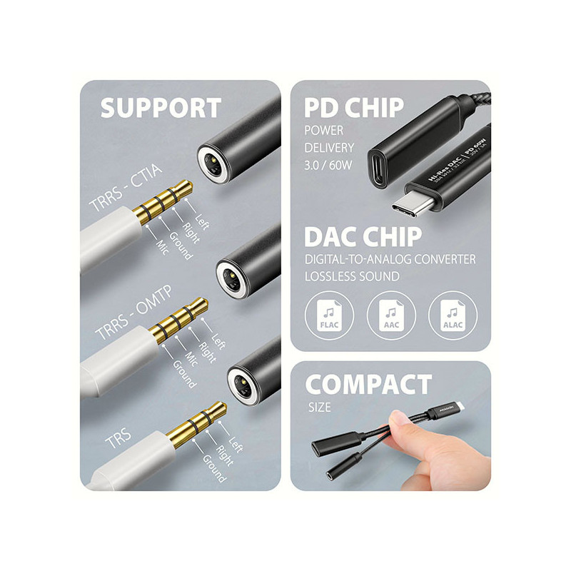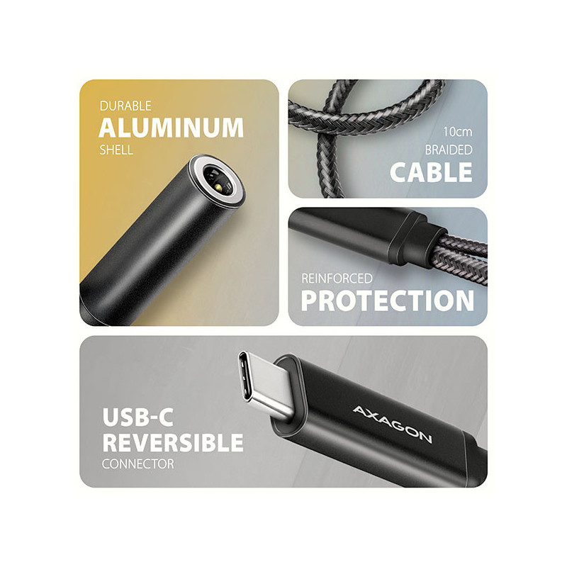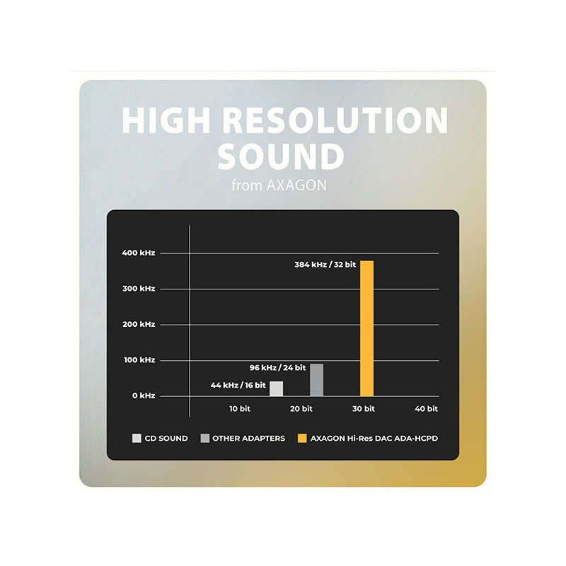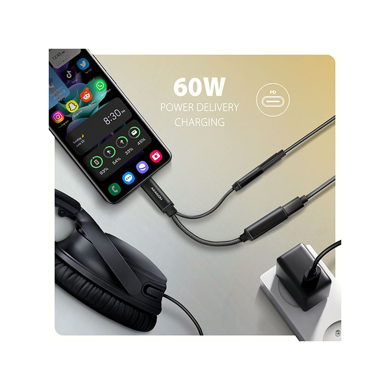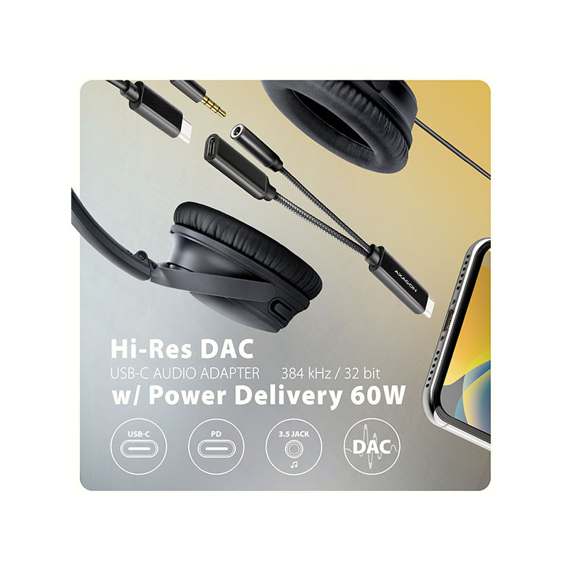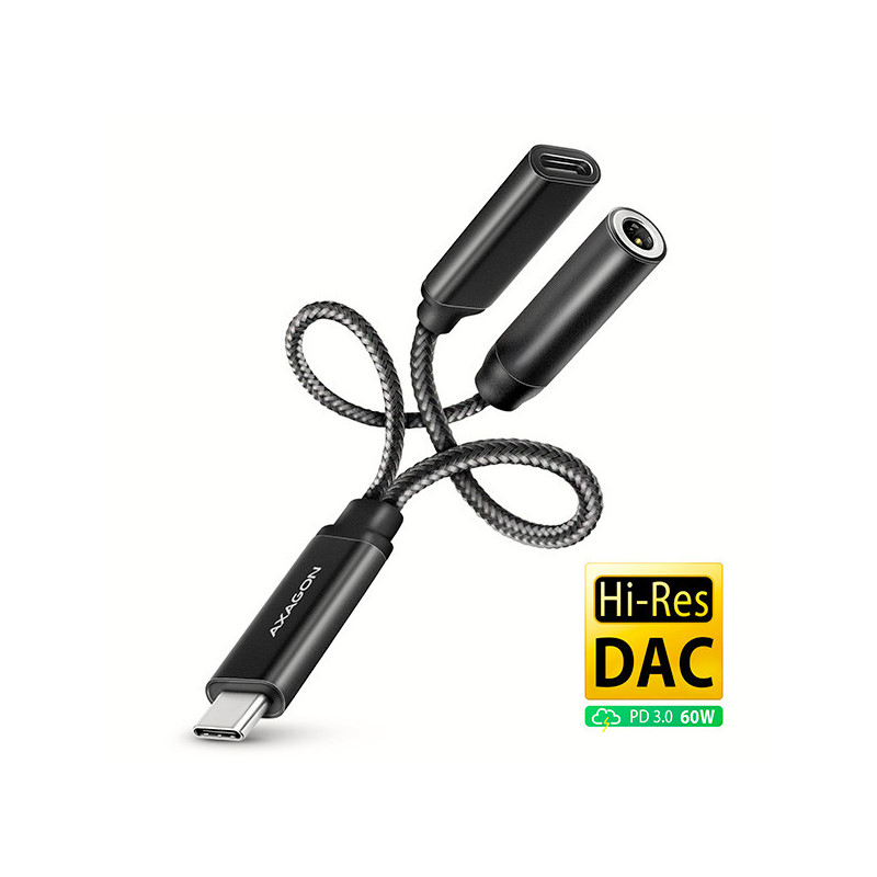 AXAGON ADA-HCPD Hi-Res DAC AUDIO ADAPTER je ideální doplňkem pro váš telefon, tablet, notebook nebo stolní počítač s USB-C konektorem, který vám poskytne chybějící 3.5 mm audio jack. Velkou výhodu představuje integrovaný konektor Power Delivery, který umožňuje současné připojení nabíječky a tím poskytuje možnost napájení připojeného telefonu. Adaptér obsahuje vysoce kvalitní DAC převodník, který při přehrávání nabízí vzorkování až 384 kHz / 32 bitů, což zajišťuje vynikající zvukovou kvalitu.