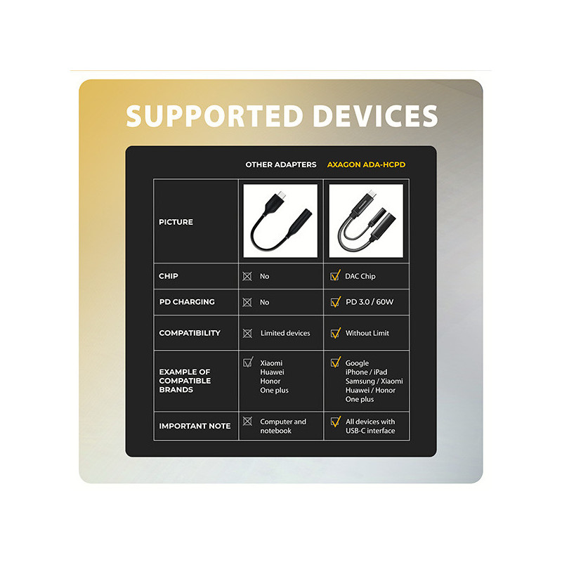 Díky DAC převodníku si s ADA-HCPD můžete vychutnat hudbu ve vyšší kvalitě než pomocí standardního sluchátkového výstupu vašeho notebooku. Dobře také poslouží jako náhrada nefunkční původní zvukové karty v notebooku a nahradí tak sluchátkový výstup nebo vstup pro mikrofon. Výhodou je také možnost připojení mikrofonu nebo headsetu pro komunikační služby WhatsApp, Messenger, FaceTime, Skype, Zoom, MS Teams, Google Meet, Discord, a podobné. Můžete ho využít i pro propojení vašeho mobilního zařízení s AUX výstupem ve vašem automobilu.